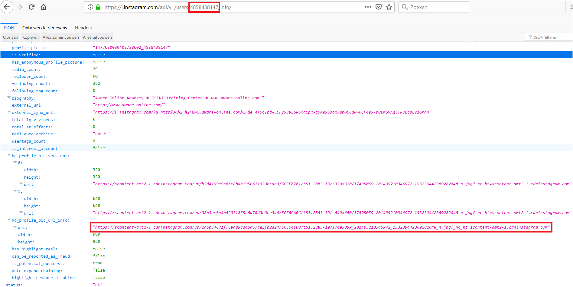 STEP 4: navigate to the following link https://i.instagram.com/api/v1/users/id/info/ and replace ‘ID’ with the ID you just copied. Click here for an example in Google Chrome. In Mozilla Firefox you get to see the results a lot better (in JSON format).